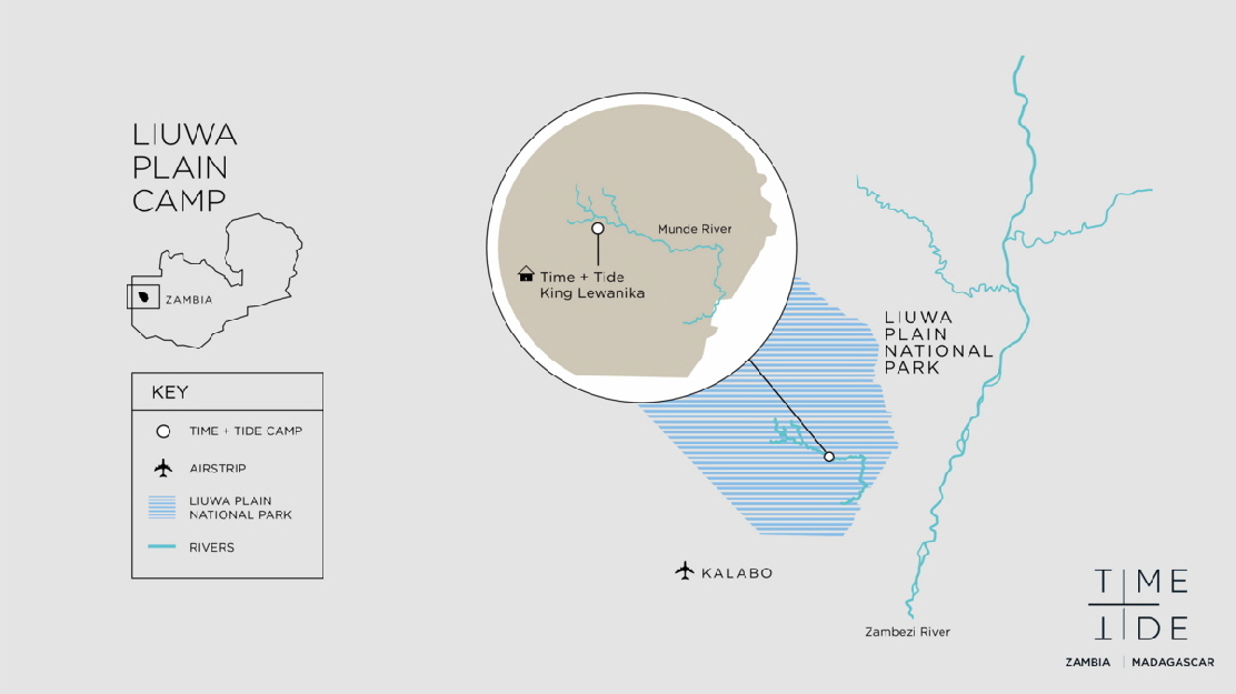 Der Liuwa Plains National Park liegt in einer sehr flachen Region, die sich mit Einsetzen der Regenfälle in sumpfiges Gelände verwandelt. Das Camp befindet sich in einem kleinen Wald am Ufer des Munde Flusses. Der Sambesi liegt 40 km Luftlinie östlich.